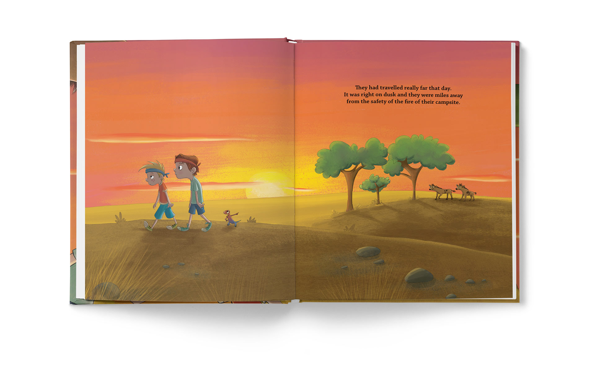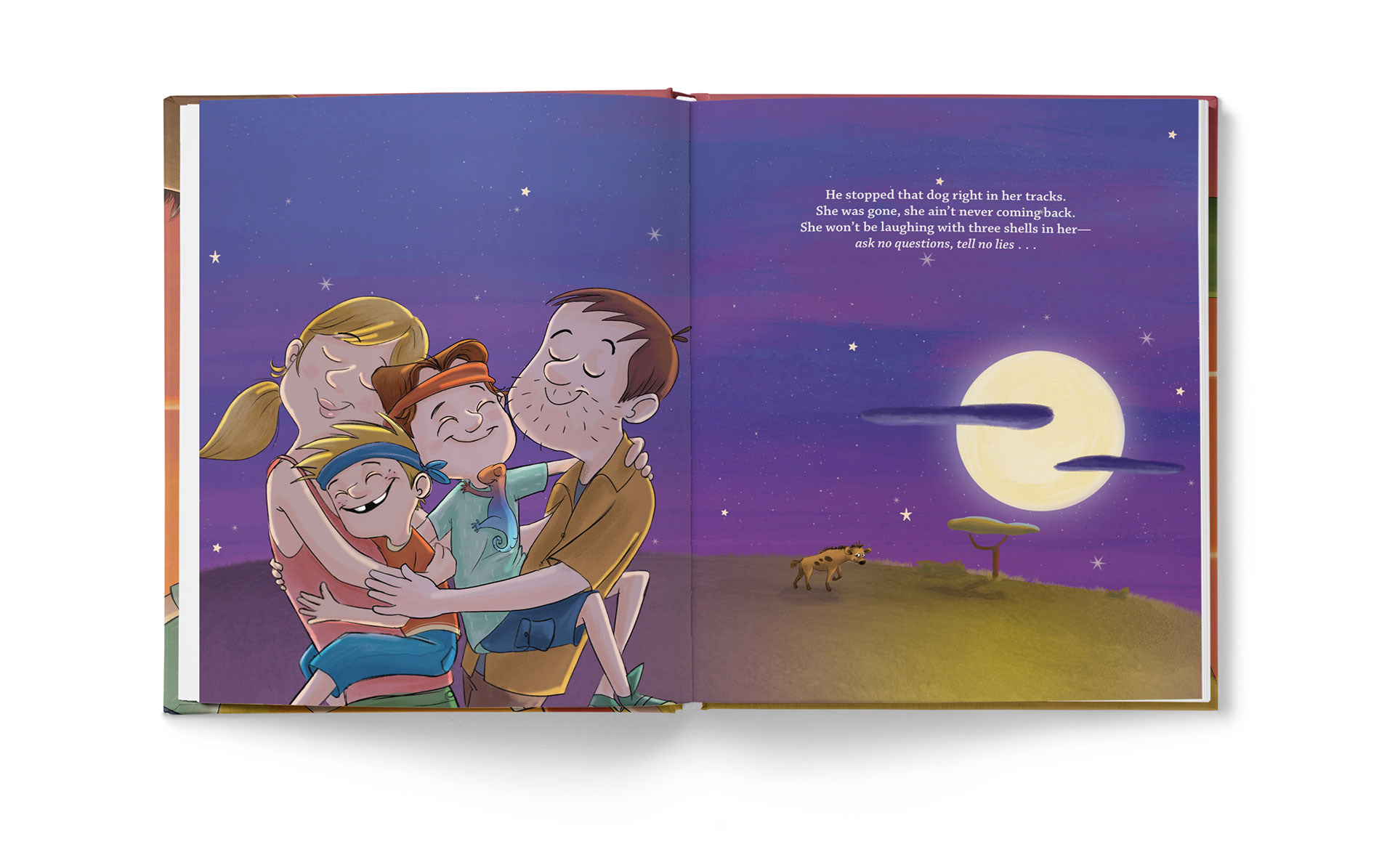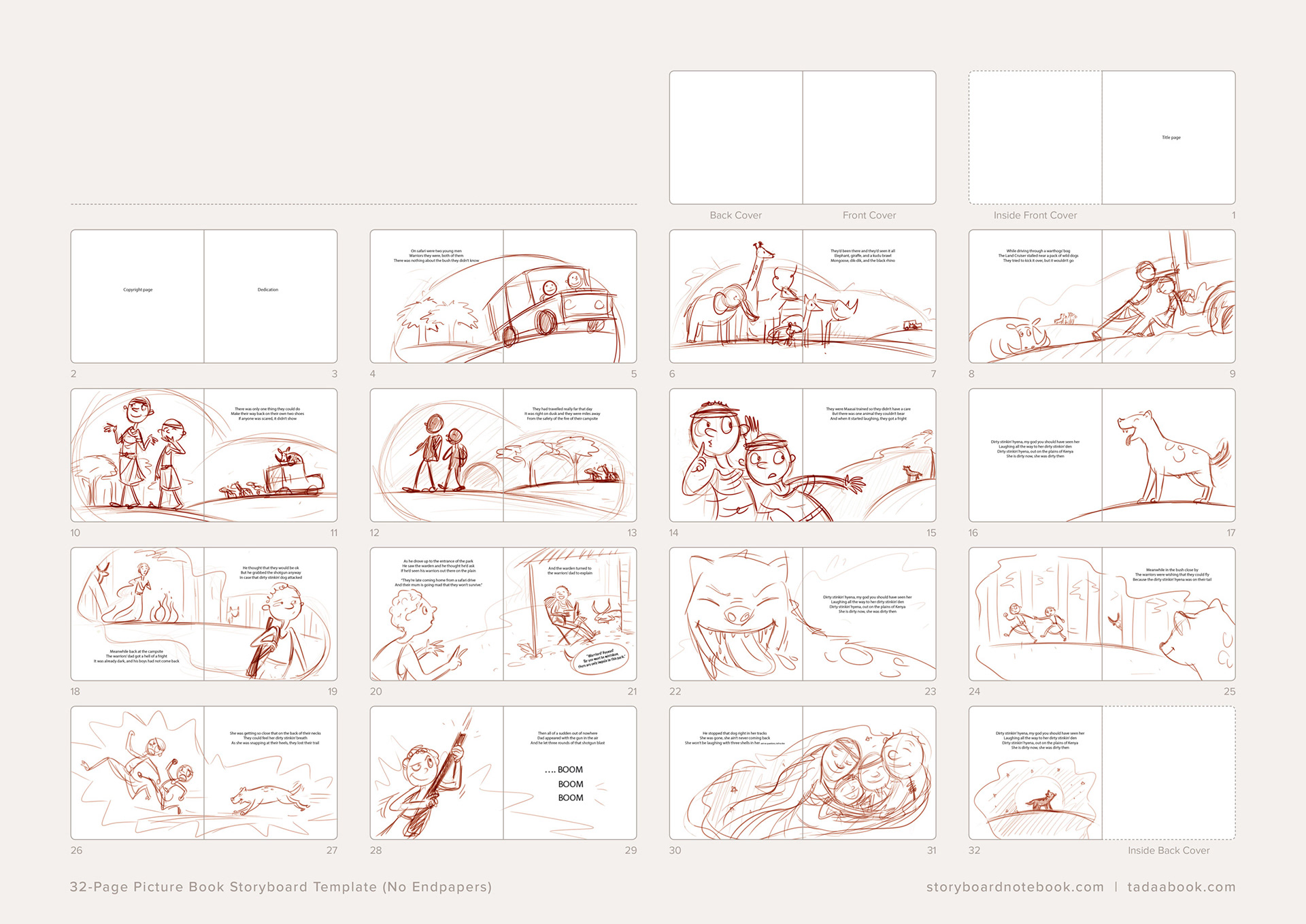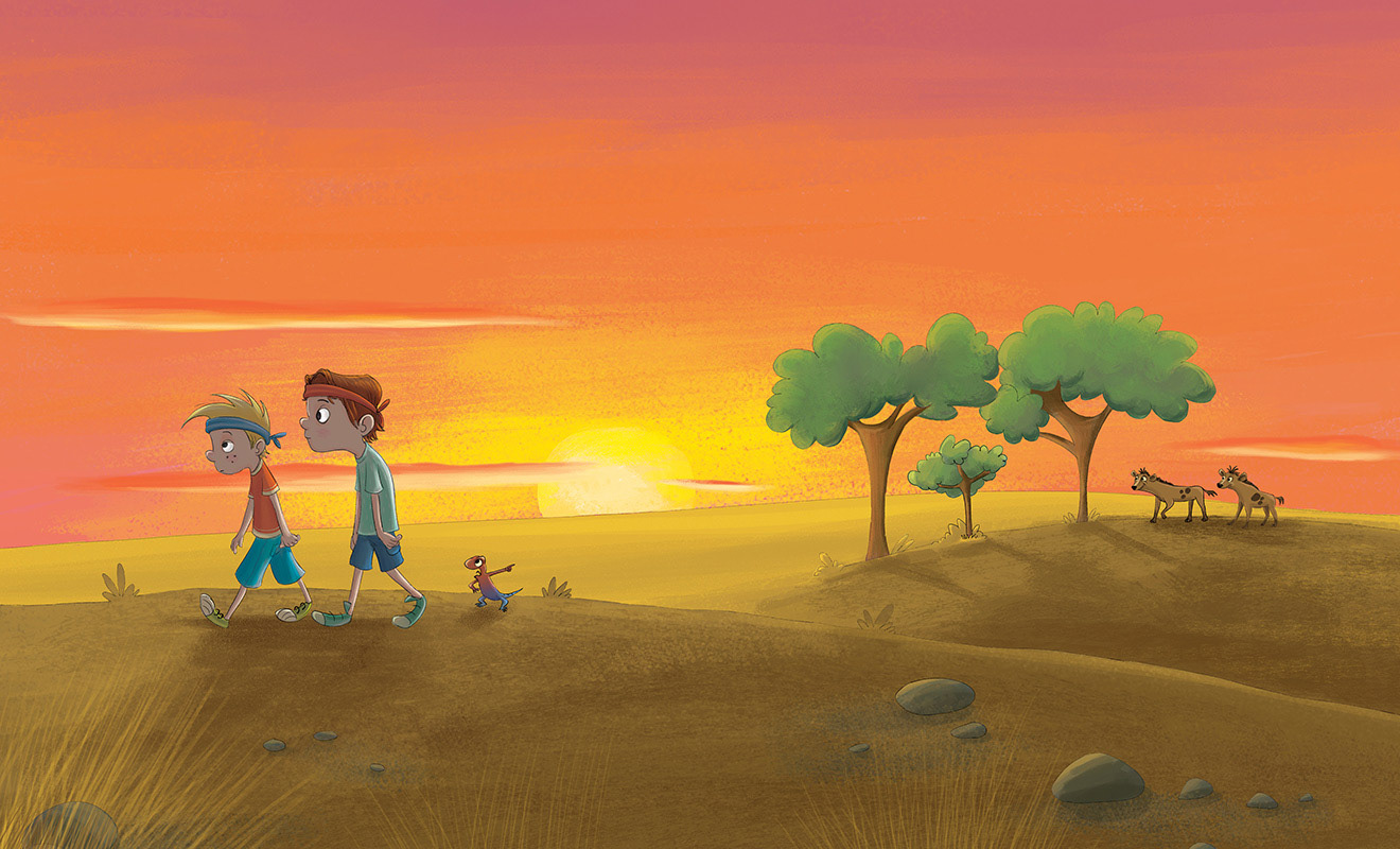 “Two young warriors become lost while on safari on the African plains. As the sun begins to set, they are surprised to find they are not alone. They hear the familiar laugh of a hyena, and before long, she is hot on their trail. Who will save the warriors from the dirty stinkin’ hyena?”