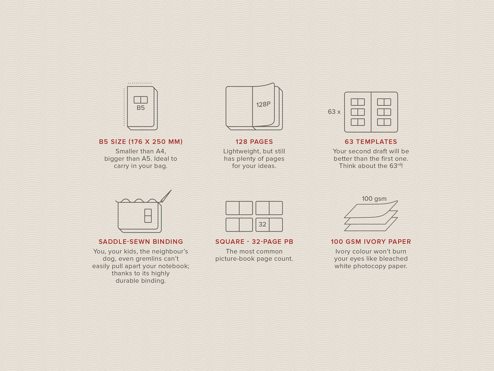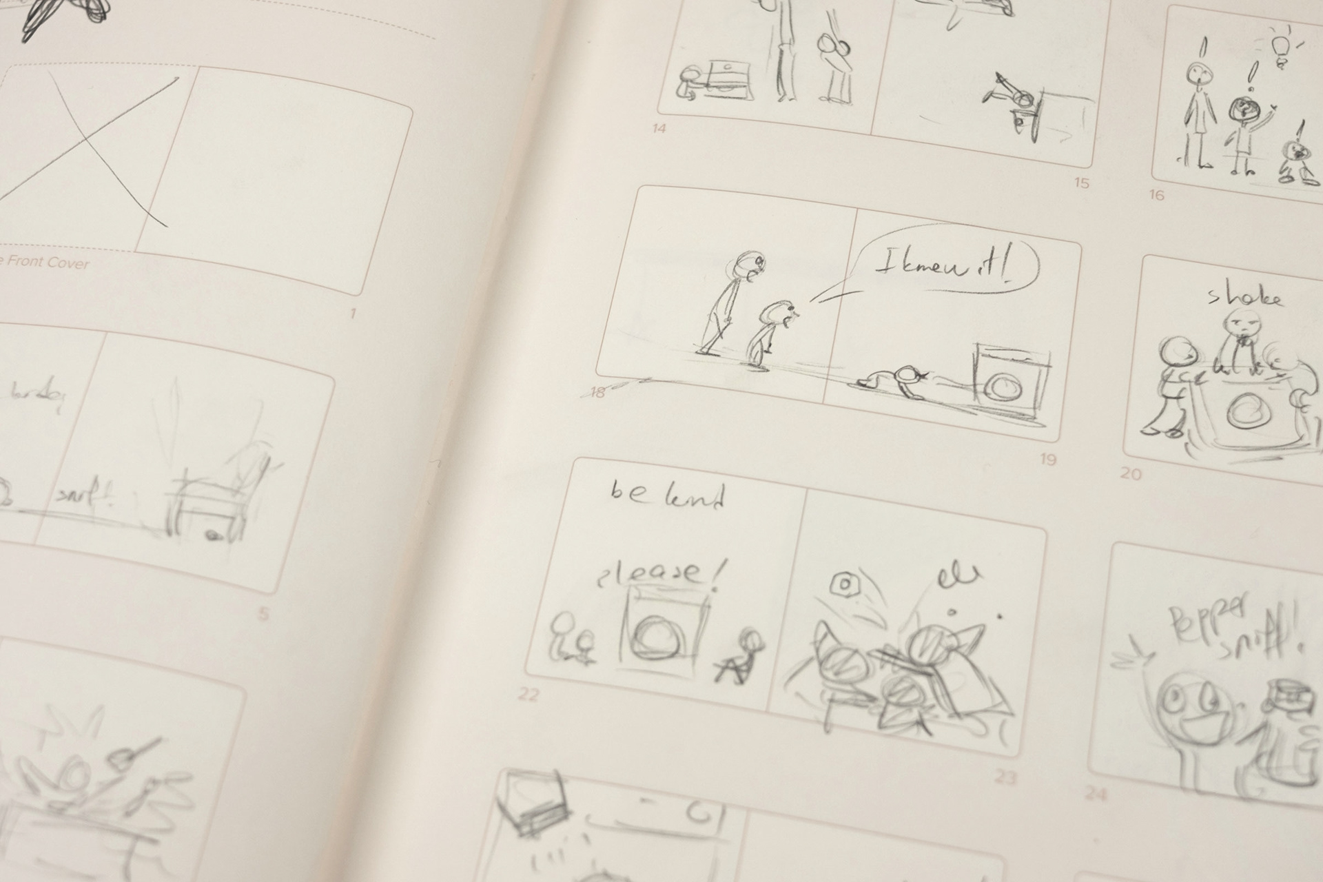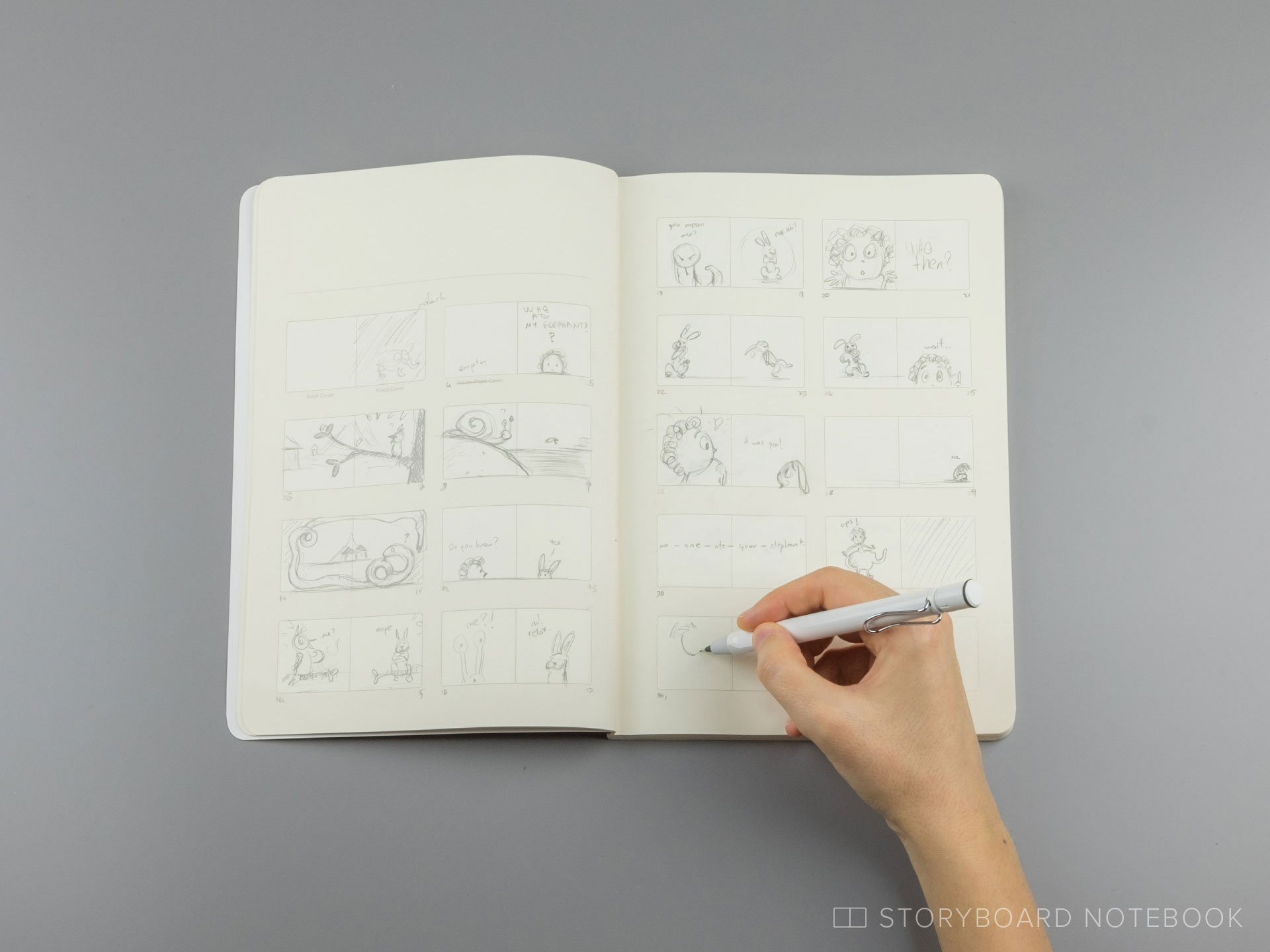 Well, actually, we created this notebook for ourselves. We storyboard a lot! We tried printing templates on basic A4 and A3 papers. But putting them together, archiving, and carrying them with us all the time was not easy. Oh, and that eye-burning white paper! We tried drawing manually with a ruler on our sketchbooks, but that was too much work. Then we ended up here.
